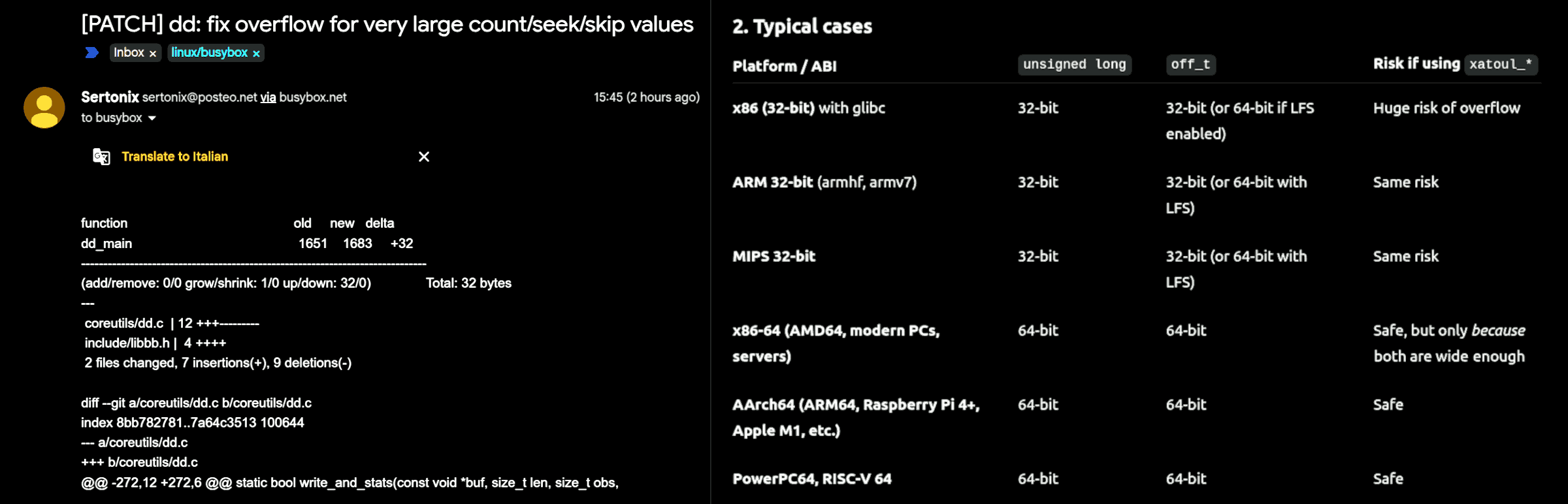 The patch, related to the e-mail header presented in the above screenshot, fixes a 32-bit truncation in busybox dd. While almost all modern desktop/server systems use 64-bit types or do not use the BusyBox as default binary for commands, embedded systems and some hardware forensic tools affected by this bug can encounter this 32-bit truncation issue.