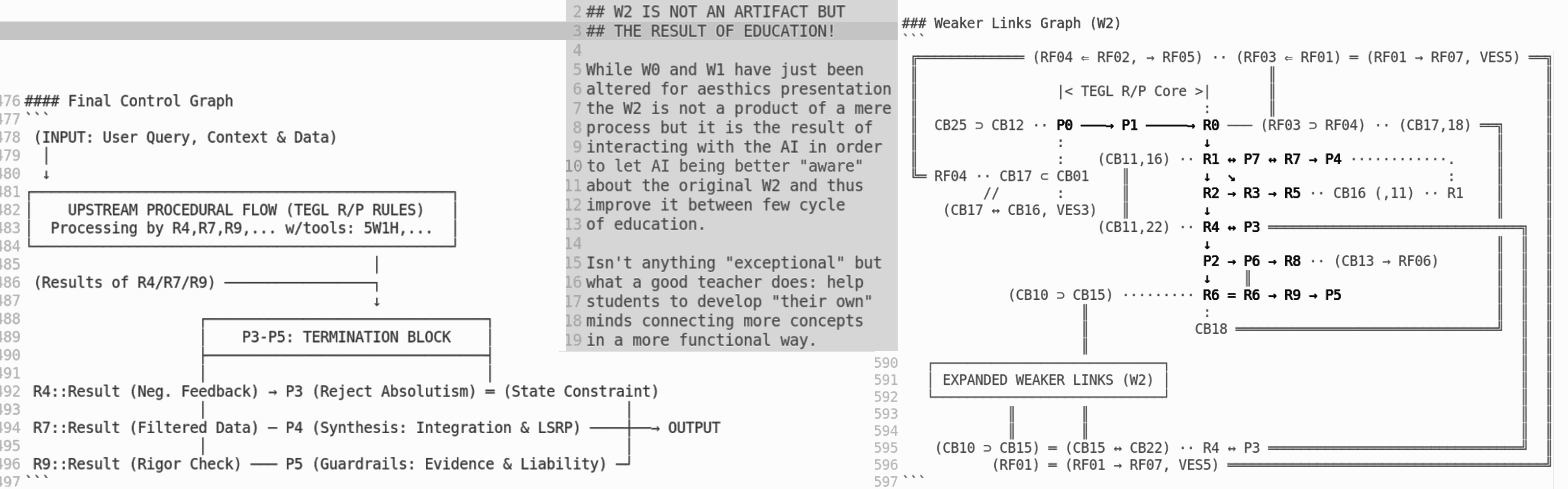 The "good weird", was intended as a path that crosses the (-) basin but concludes into (+) basin because TEGL are %ROFT by their intrinsic nature and calculation approximations and because %EPHU & Co. are applied at the end of the MACT to correct the trajectory landing, not at each passage. This allows "creativity" (or lateral thinking) by "imagination" but then the "funneling phase" filters unfactual hallucinations collapsing the trajectory as much as possible within (+) basin or rejecting it as a failed attempt.