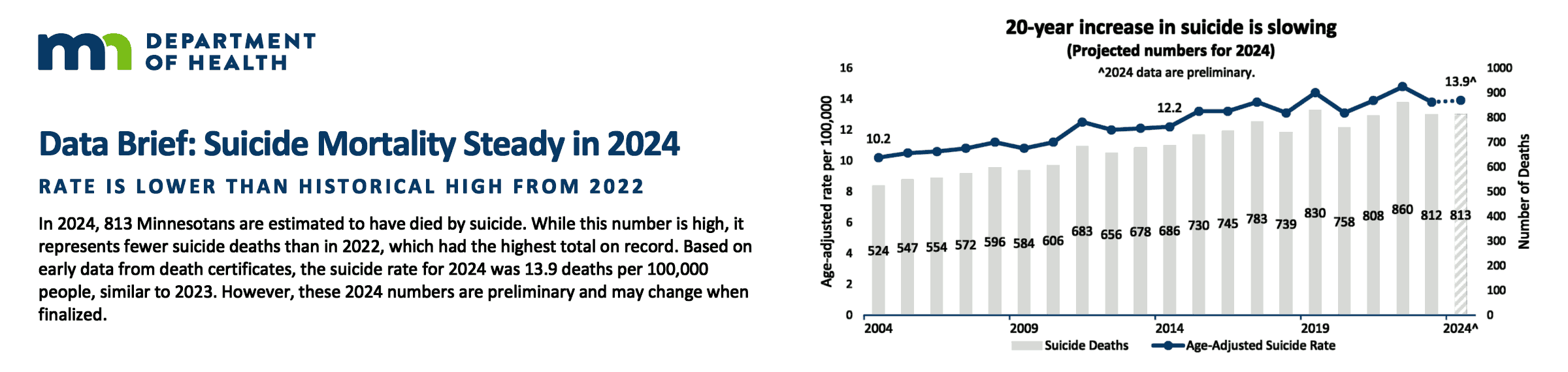 Based on early data from death certificates, the suicide rate for 2024 was 13.9 deaths per 100,000 people, similar to 2023. However, these 2024 numbers are preliminary and may change when finalized.