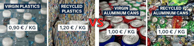 Quindi, per esempio, un sacco di pellet di plastica vergine costa 90 + IVA = 110, mentre un sacco di plastica 100% riciclata costa 120 e il divario rimane, perché c'è un vantaggio di 10 su 110 (9%) in favore della plastica vergine.